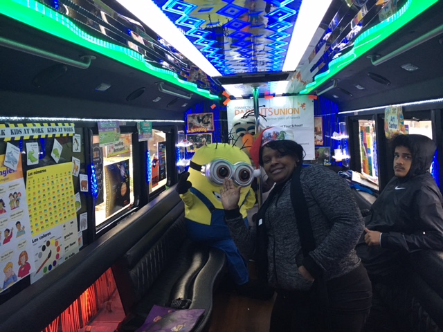The annual bus tour run by the Connecticut Parents Union – an education advocacy group – is staffed with high school volunteers who dress up as movie characters and distribute children’s books donated by various companies, like Scholastic.