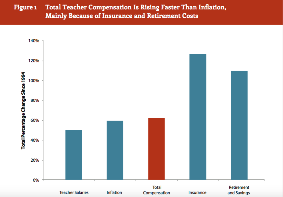 Compensation for teachers is rising faster than inflation, according to the study, but that doesn’t mean teacher salaries are growing at a commensurate pace. Instead, retirement and insurance costs — which make up total teacher compensation — are growing extremely fast, while salaries have not risen as quickly.