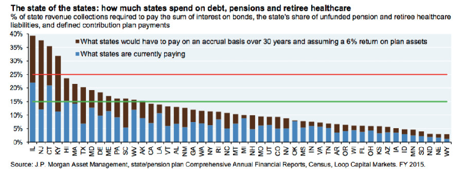 The commission examined a number of metrics showing that Connecticut’s pension and healthcare liabilities have reached levels that threaten to destabilize the state. In particular, a report by J.P. Morgan showed Connecticut as one of only four states whose debt costs were over 25 percent of the state’s revenue.