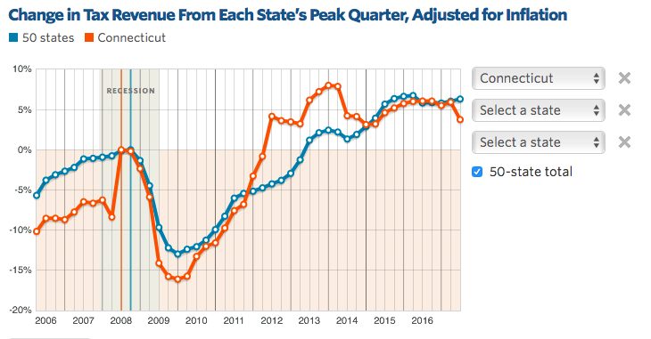 Connecticut’s major tax increases in 2009, 2011 and 2015 may have offered the state temporary budget relief, but in the end Connecticut appears to be a little worse off than the rest of the country.