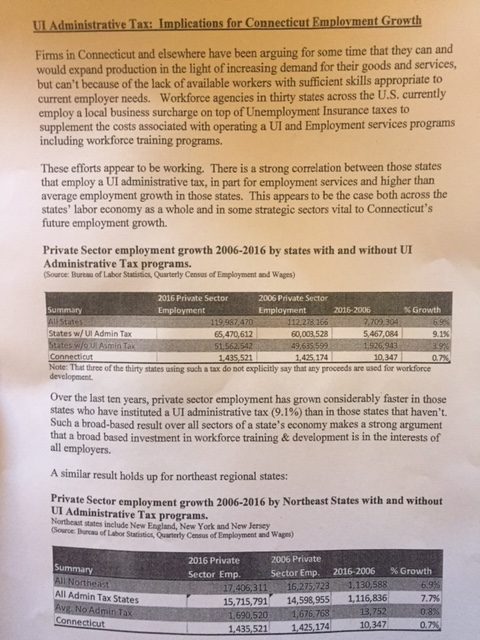 The handout claims that states with the administrative tax have seen 9.1 percent higher job growth and implies that maintaining adequate staffing levels at DOL will help fill Connecticut manufacturing jobs with training and placement for people who are unemployed.