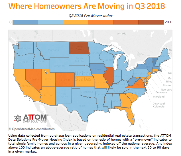 Blomquist notes, however, that states with high migration trends have a higher pre-mover index. Nevada has a lot of people moving into the state and scored a 164, while Illinois has a high outmigration pattern and scored a 196.