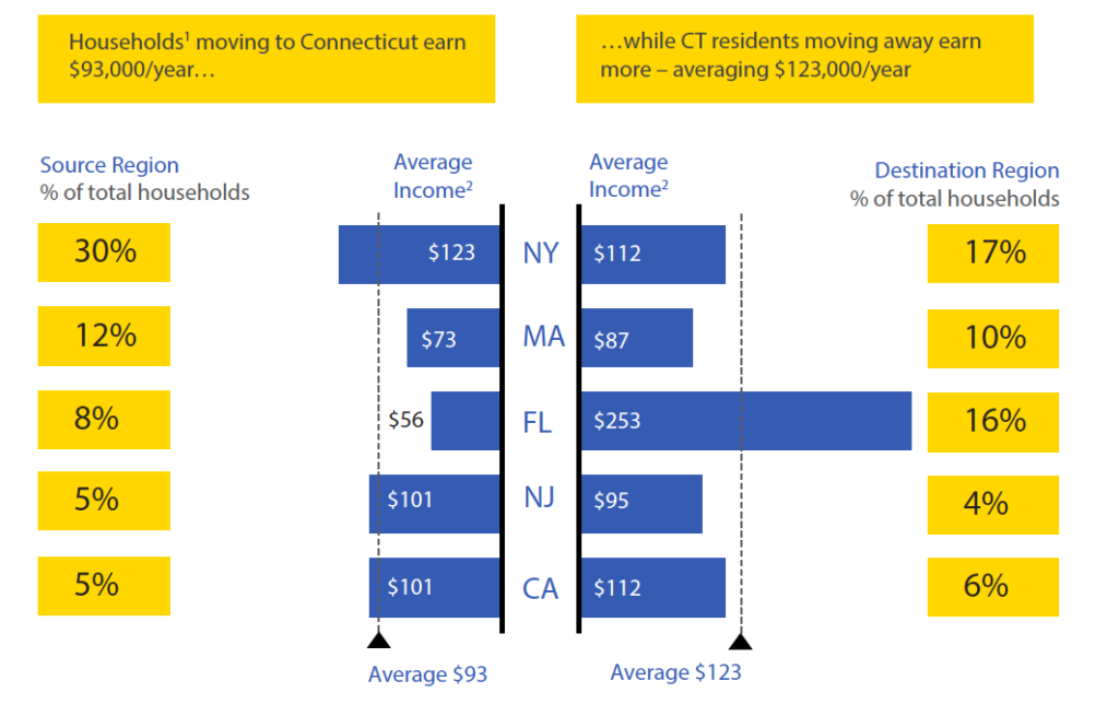 According to the Commission on Fiscal Stability and Economic Growth’s final report, “Those migrating to Connecticut are earning less than those who are departing by $30k per household.”
