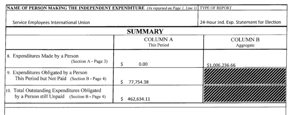 According to the union’s November 1 independent expenditure filing, the union representing 25,900 service employees had spent $1,006,236.66, an increase of $449,548.09 over their previous filing on October 26.