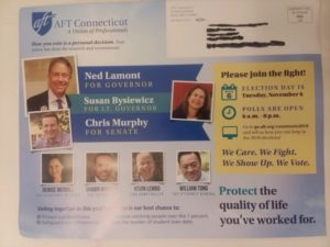 AFT’s most recent mailing encouraged members to vote for Lamont, Senator Chris Murphy, Comptroller Kevin Lembo, Secretary of State Denise Merrill, Attorney General candidate William Tong and State Treasurer candidate Shawn Wooden.