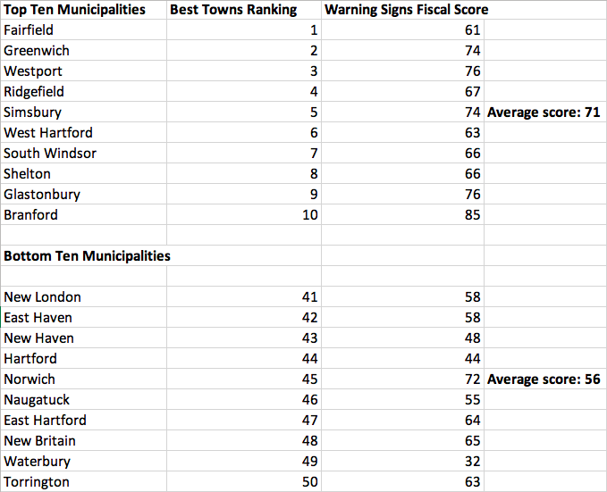 A number of municipalities which scored low on business friendliness, such as Waterbury, New Haven and Hartford face severe fiscal challenges.
