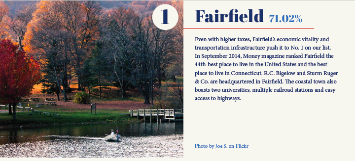 Unsurprisingly, a number of suburbs surrounding cities like Hartford and Bridgeport scored well in the study.