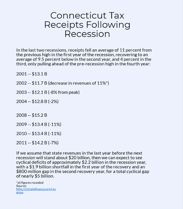 There is always another recession coming. Business-cycle history suggest the next one is only a year or two off, as Lamont himself has recognized. When the next recession comes, we should expect it to cut state revenues by more than $2 billion in the first year, with full recovery coming only in the fourth year. This means that the next recession could well blow an aggregate $5 billion cyclical hole in the state budget, by a conservative estimate.