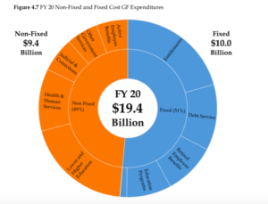 Fixed costs are comprised of pension payments for state employees and teachers, retiree healthcare, bonded debt and Medicaid spending.