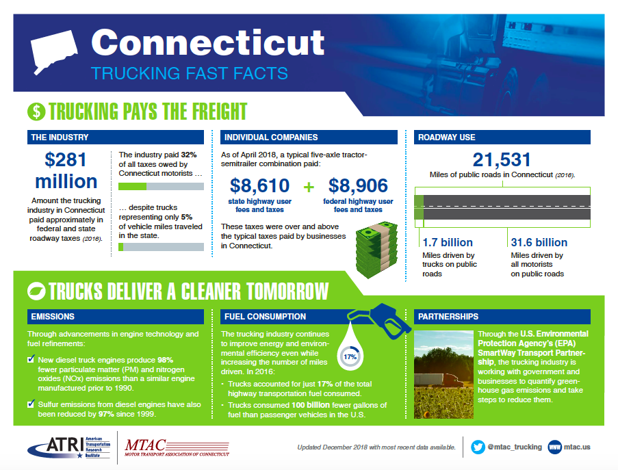 A fact sheet released by ATRI notes the trucking industry paid 32 percent of all state taxes owed by motorists, while only accounting for 5 percent of the miles traveled in Connecticut.