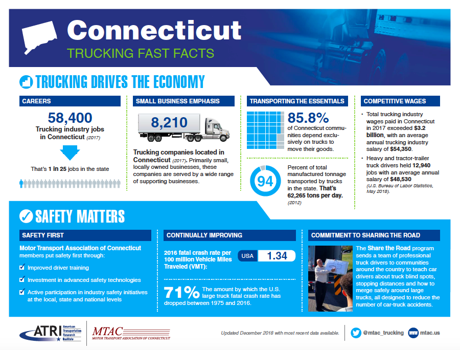 ATRI reports that trucking industry jobs account for 1 in 25 jobs in the state of Connecticut, with 8,210 trucking companies located in the state. ATRI says those companies are “primarily small, locally owned businesses.”