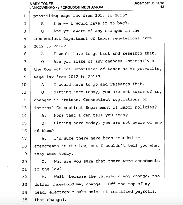 Toner – the wage enforcement agent assigned to investigate the complaint against Ferguson – testified that she was unaware of any relevant legislative or policy changes to prevailing wage law between the time she investigated Ferguson in 2012 and when she investigated them in 2016.