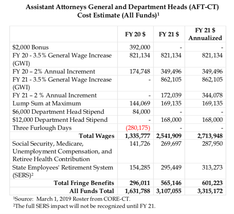 The OFA notes there were no wage increases for AAG’s between 2017 and 2019, and the bonuses and salary increases are equivalent to the wage increases outlined in the 2017 SEBAC agreement, negotiated between Gov. Dannel P. Malloy and state union leaders.