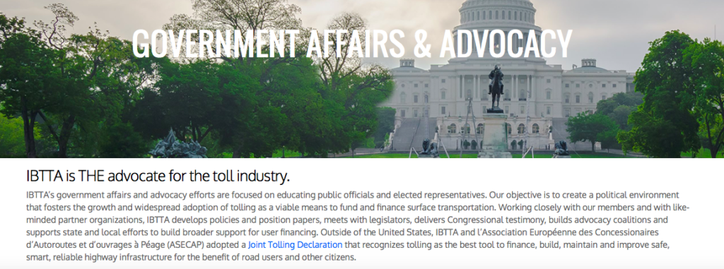 The International Bridge, Tunnel and Turnpike Association is an association of owners and operators of toll facilities and businesses that serve the toll industry and labels itself “THE advocate for the toll industry.”
