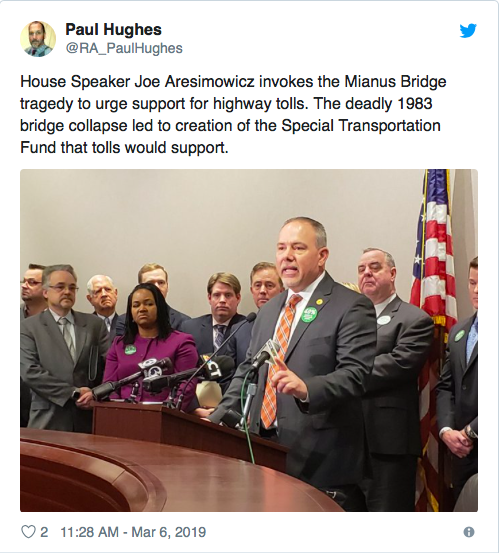 Legislative leaders like House Speaker Joe Aresimowicz and Gov. Lamont have referenced the collapse in their push for tolls on Connecticut’s major interstate highways, which are projected to raise $800 million per year under the governor’s latest proposals.