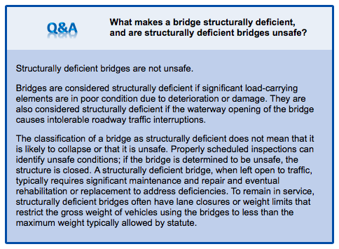According to the FHWA bridges deemed structurally deficient “are not considered unsafe,” but rather that the bridge will require maintenance, repair and eventual rehabilitation.