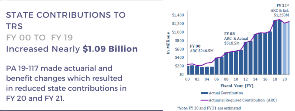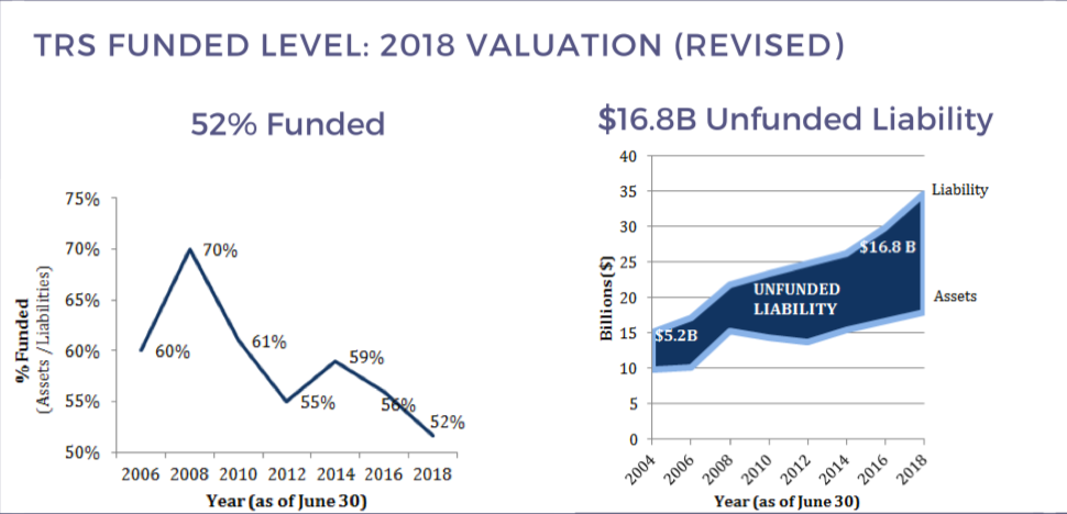 The assumed rate of return – or “discount rate” – was lowered in 2018 to 6.9 percent to better match actual market returns. The ten-year rate of return was closer to 5 percent and last year’s return was 5.9 percent. Another market recession could put the TRS in an even worse position with negative returns.
