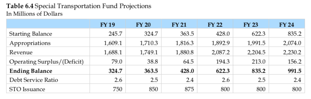The state’s Special Transportation Fund is expected to maintain surpluses through 2024, despite the legislature diverting $178 million from transportation in order to balance the budget. Revenue to the STF is expected to grow from $1.7 billion in 2020 to $2.2 billion in 2024.