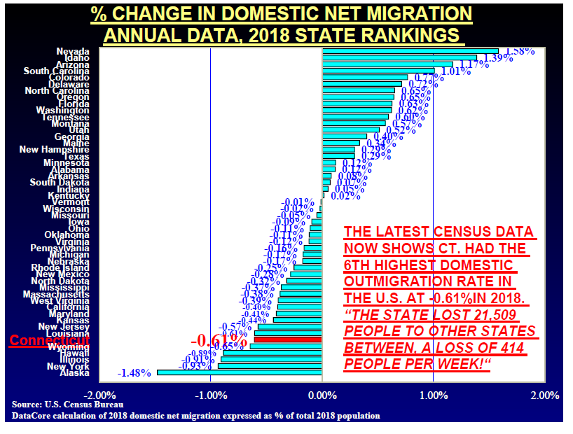 Connecticut’s net loss of population ranks sixth in the county for 2018. Just one year ago, Connecticut’s outmigration rate was eighth highest.