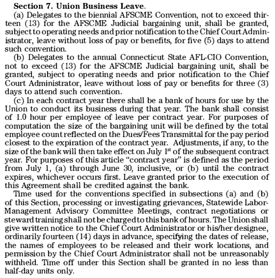 According to the contract, the roughly 1,540 hour bank of union leave time is not charged for “processing or investigating grievances, Statewide Labor-Management Advisory Committee Meetings, contract negotiations or steward training. The union leave bank is not even charged for union members to attend Connecticut AFL-CIO conventions.
