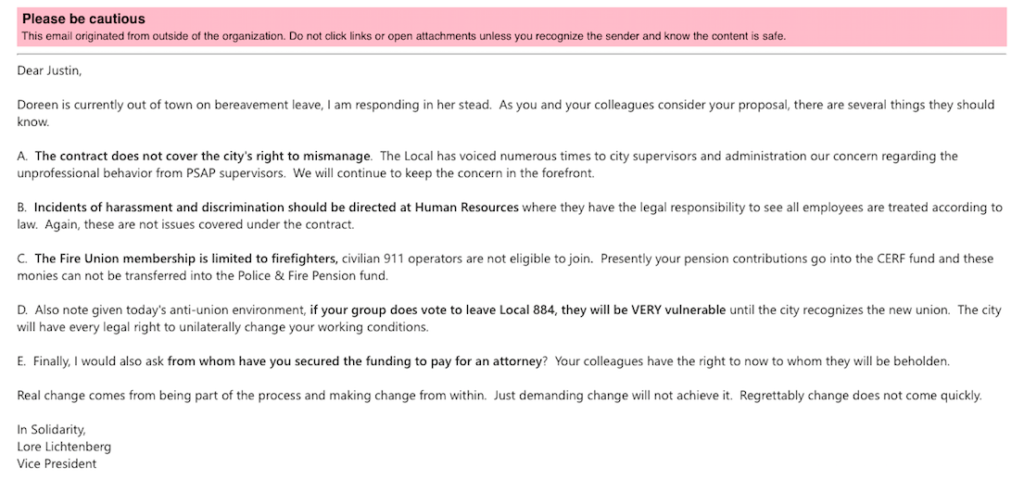 “Given today’s anti-union environment, if your group does vote to leave Local 884, they will be VERY vulnerable until the city recognizes the new union,” Lichtenberg wrote. “The city will have every legal right to unilaterally change your working conditions.”