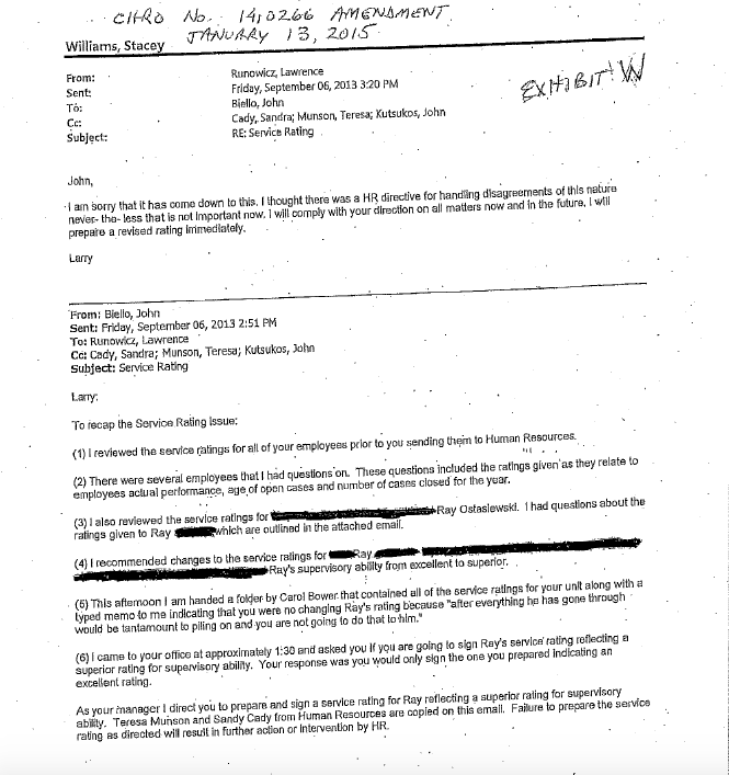 According to the complaint and documented emails obtained under a Freedom of Information request, Biello ordered Ostasiewski’s manager – Lawrence Runowicz — to lower his supervisory service ratings from “excellent” to “superior” while Ostasiewski was a candidate for the promotion to become Revenue Services Tax Supervisor.
