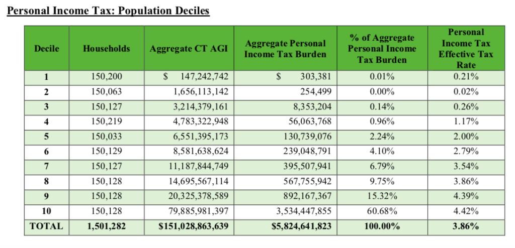 According to the 2014 tax incidence study, the wealthiest 357 families in Connecticut paid 11.7 percent of the total personal income tax burden for the state. By another measure in the report, the wealthiest ten percent of income earners — those earning $165,394 and up — paid 60.68 percent of the income tax burden.