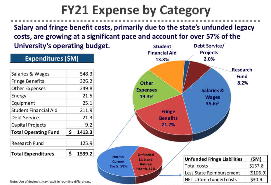 Also weighing on UConn’s budget is Connecticut’s unfunded pension liabilities, a continual source of deficit for both UConn and UConn Health.
