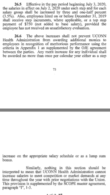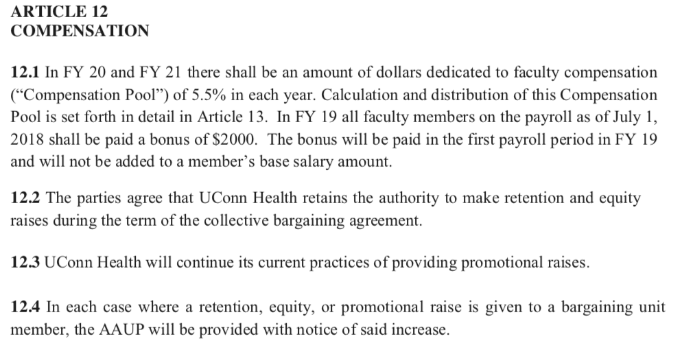 The contract provisions allow for increases in the salary schedule of employees or lump sum bonuses in order for UConn Health remain competitive. The bonuses or salary increases can also be based on merit and are limited to one per year.
