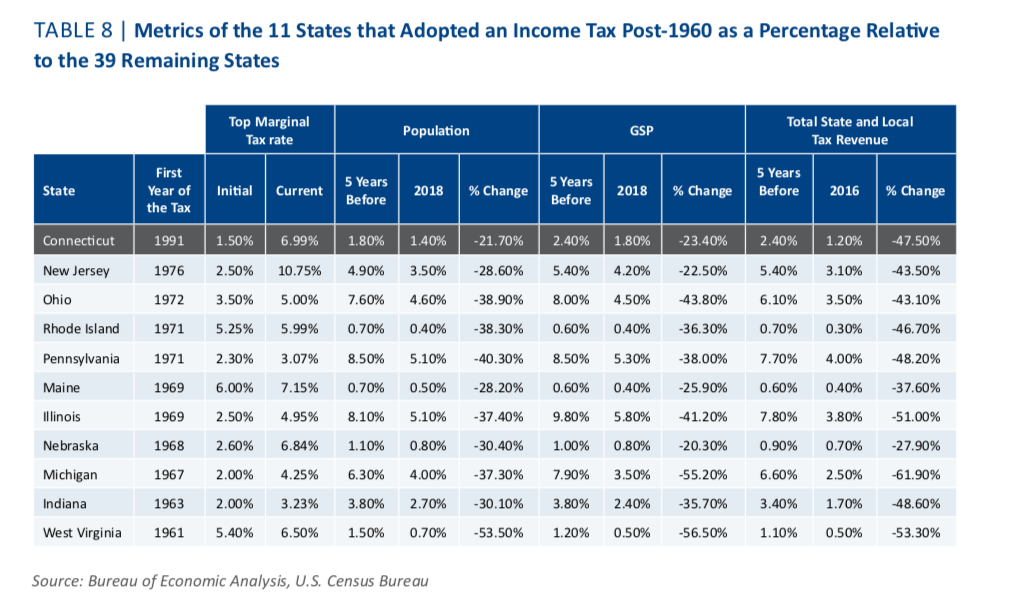 **This article was corrected to show the metrics of Connecticut’s population decline are relative to 39 other states that have not adopted an income tax since 1960**