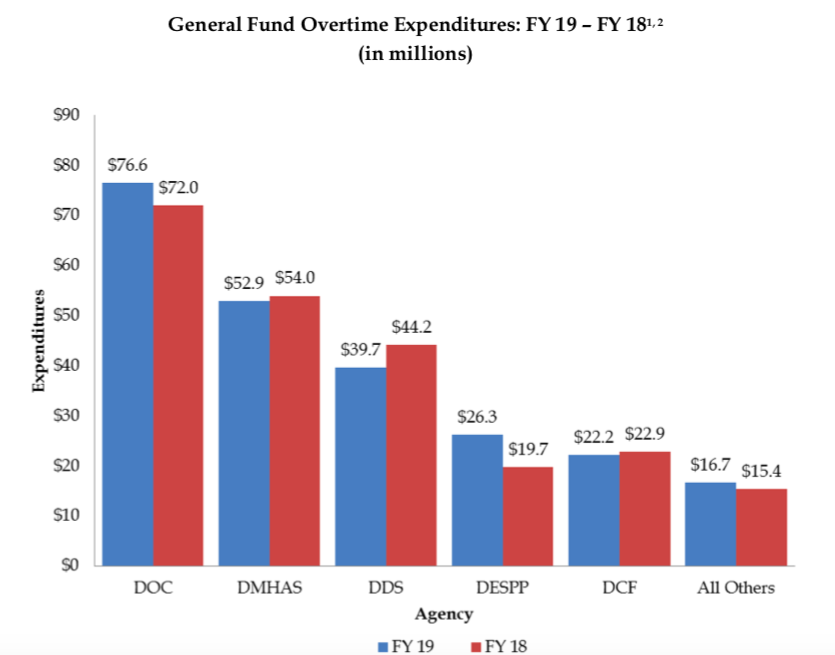 In fiscal year 2018, DMHAS spent $54 million on overtime and $52.9 million in fiscal year 2019.