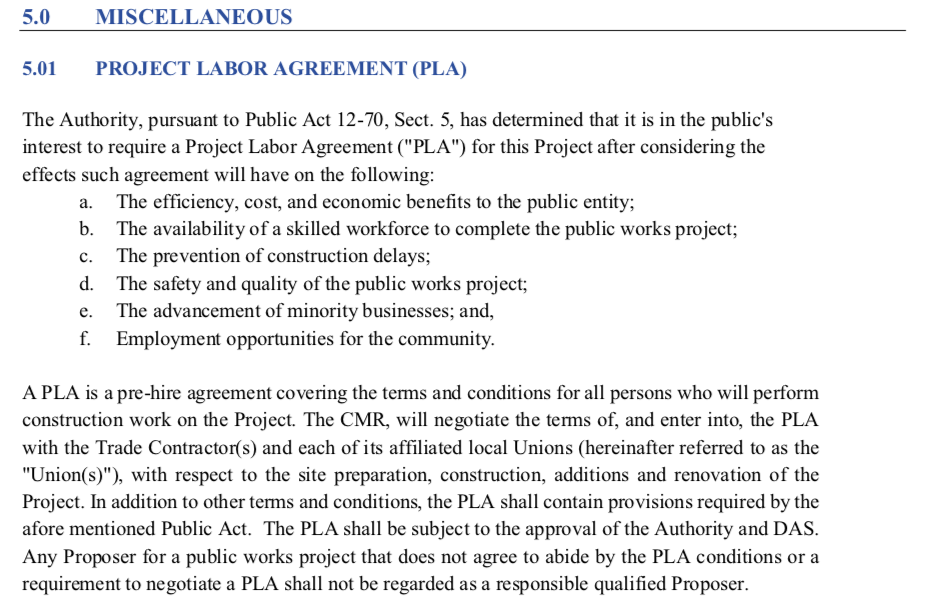Despite the potential for increased costs and fewer bidders, the Lamont administration has shown a favoritism toward project labor agreements in the past.