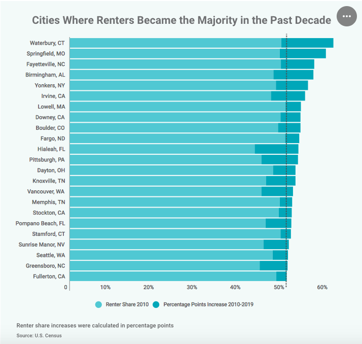 “Waterbury, Conn., saw the most dramatic change in the structure of its population,” the study says. “Renters here now make up 60.9% of the brass city’s residents, compared to 48.8% at the beginning of the decade.”