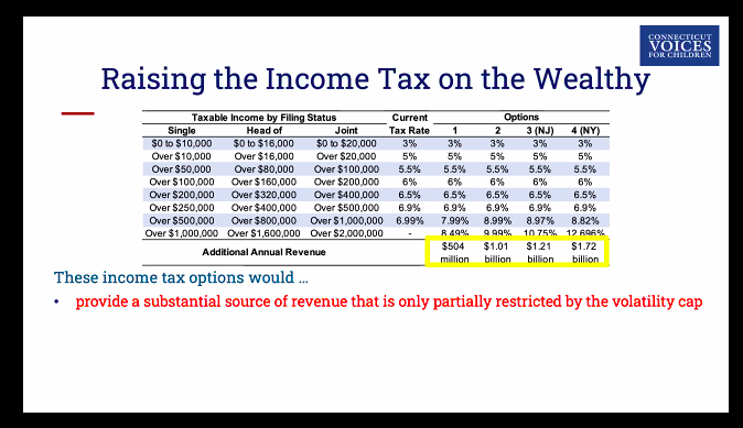 CT Voices, the Progressive Caucus in Connecticut’s House of Representatives and government unions have been pushing for years for Connecticut to raise taxes on top earners. Connecticut’s top income tax bracket has been raised three times since the state implemented the state income tax in 1991.