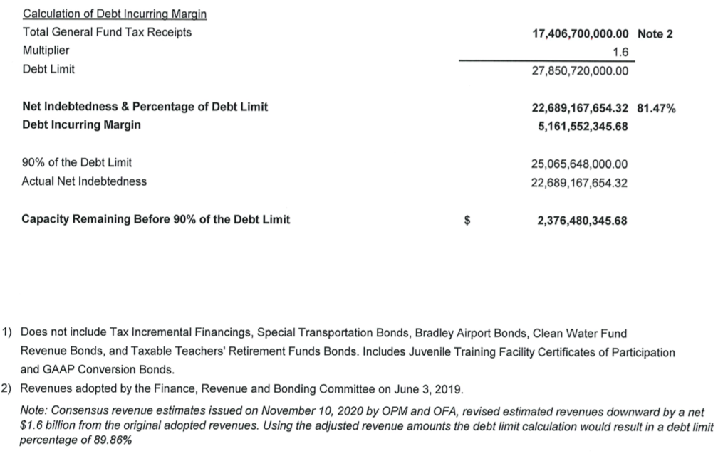 Although Connecticut’s Rainy Day Fund stands at a healthy $3 billion, it will not be enough to mitigate the $4.3 billion deficit for fiscal years 2022 and 2023 and while the state’s reserves may help bridge fiscal gaps in the near-term, it won’t affect Connecticut’s debt limit, which is based on tax revenues.