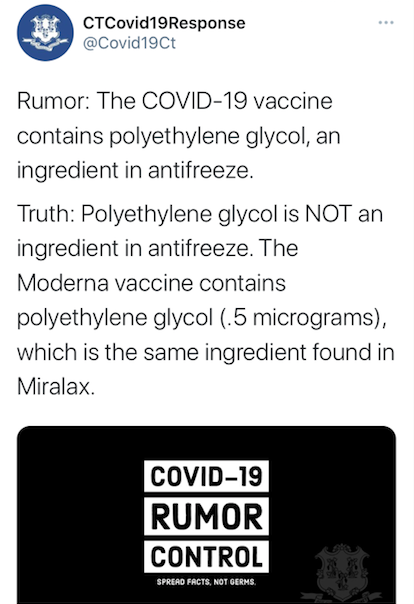 The email provides several links to Twitter and Facebook posts by CT Covid-19 Response which debunk rumors surrounding the COVID-19 vaccine.