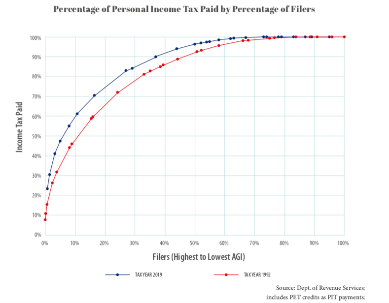 In 1992, roughly half of Connecticut’s income tax revenue came from 12 percent of the state’s population. By 2019, the number of families paying half of Connecticut’s income tax revenue had shrunk to 6 percent, according to the study.