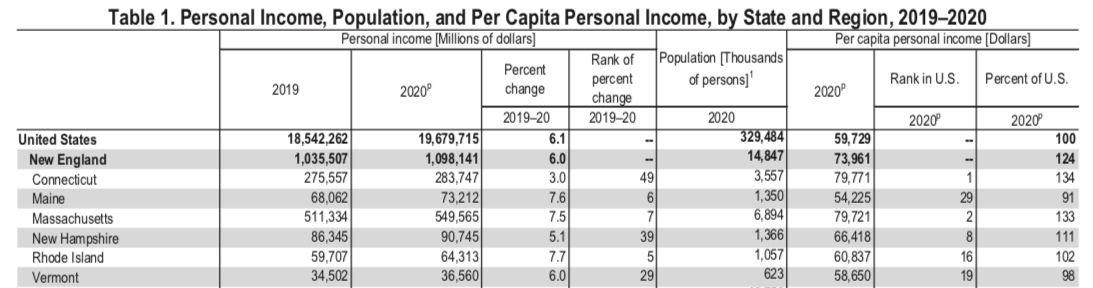 Over the years of 2019 and 2020, Connecticut’s per capita income increased by 3 percent, the second slowest rate in the country, while Massachusetts increased 7.5 percent, the seventh fastest rate in the country
