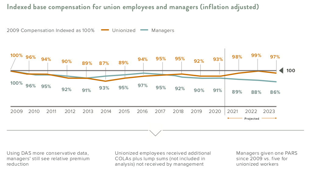 With more than 90 percent of the state workforce part of a union, management pay has been one of the few labor costs the state could cut back on without entering into protracted labor negotiations with the State Employee Bargaining Agent Coalition.