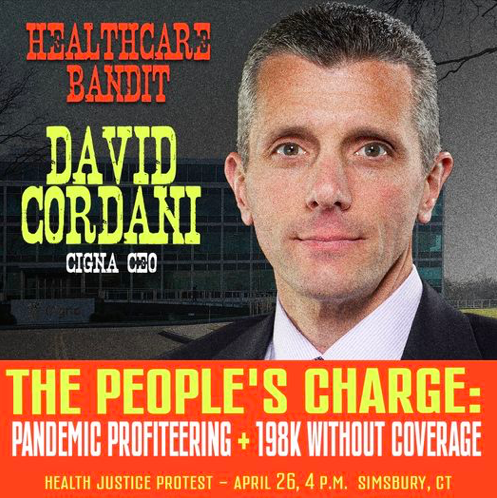 The protest invitation labels Cordani as a “healthcare bandit” and protesters will “charge” him with “gross negligence” and reckless endangerment” of the health of Connecticut’s residents for opposing the public healthcare option.