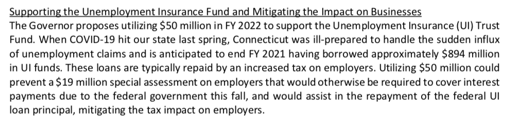 Now, with the federal government sending the state a $2.6 billion slush fund to be used for fiscal recovery, Gov. Ned Lamont has proposed paying back $50 million of the borrowed unemployment money, leaving Connecticut businesses on the hook for the remaining $844 million.