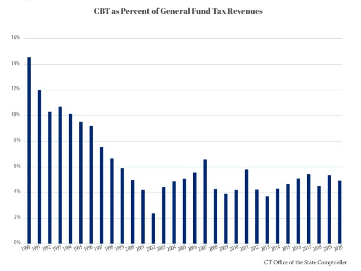 Connecticut’s reliance on the corporate business tax has diminished in the last three decades, going from 15 percent of the budget in 1990 to 5 percent by 2020 and taking in $834 million per year on average over the last five years.