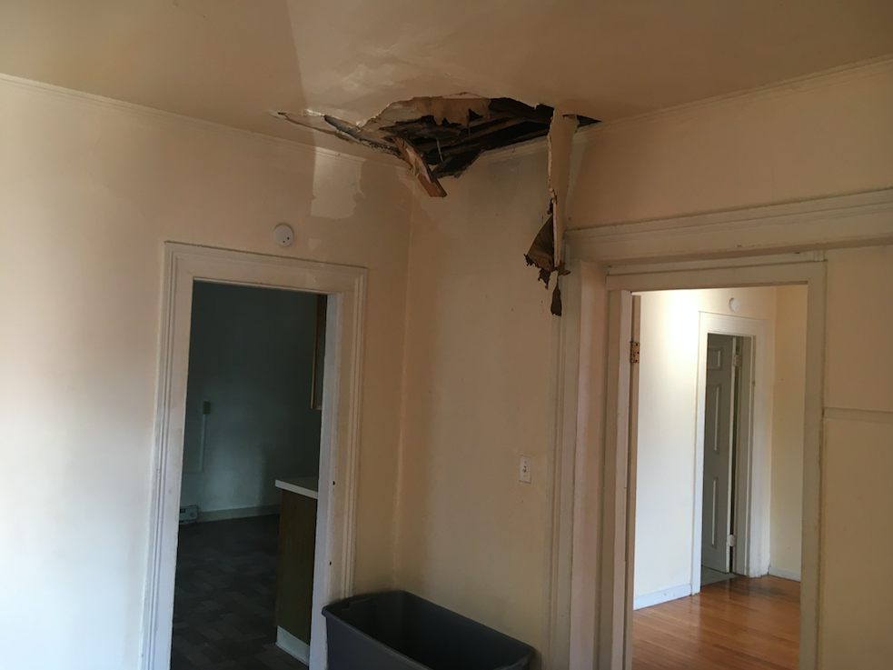Inside, several flooding incidents from the second floor caused a collapse of the drywall ceiling in the first-floor apartment. Alvin believes the flooding is intentional, showing a picture of when Mary ran a hose out of the second-floor window and continuously ran water into the yard.