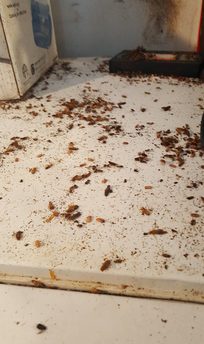 Alvin has pictures from inside the second-floor apartment, from the time he was allowed inside with repairmen to replace the refrigerator, stove and do electrical work. The top of the refrigerator is covered in dead cockroaches, the floor moldy and littered with trash.