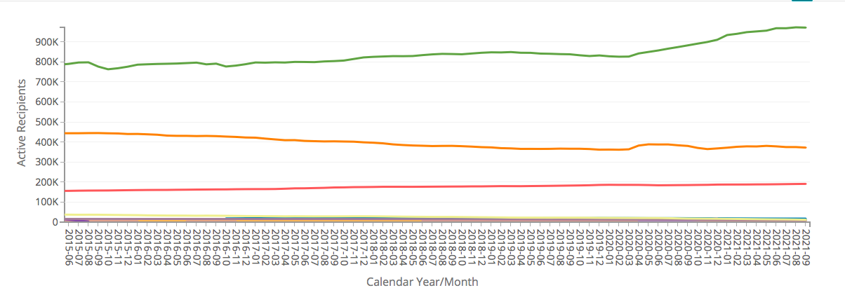 Following an initial bump in March and April of 2020, the number of SNAP recipients has slowly declined, leaving 372,126 individuals remaining on the program, a 2.9 percent increase over February of 2020.