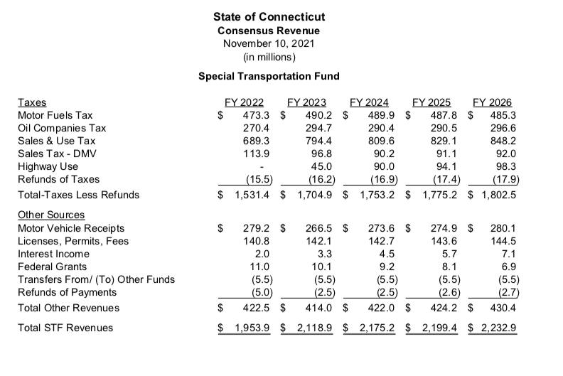 But while calls for more revenue streams to the STF continue, the increase in the price of oil and gasoline sent projected revenue from Connecticut’s petroleum gross receipts tax upward by more than $45 million over fiscal years 2022 and 2023.