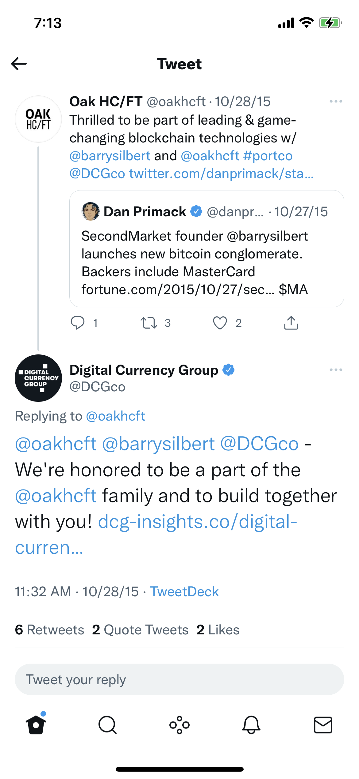At the time Oak HC/FT tweeted that it was “Thrilled to be part of the leading & game-changing blockchain technologies w/@barrysilbert and @oakhcft.”