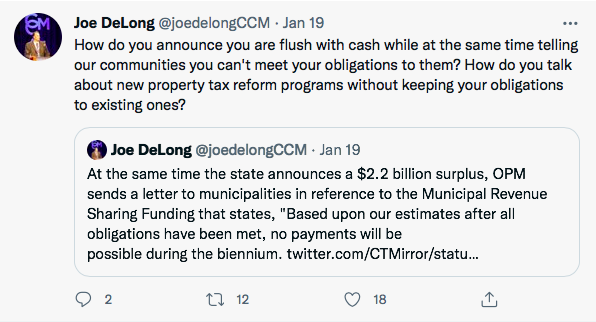 The day before Connecticut officials announced consensus revenue estimates of a $2.2 billion surplus in the state’s finances, the Office of Policy and Management sent a letter to municipal leaders across the state informing them that there would be no money in the Municipal Revenue Sharing Account for municipal grants.