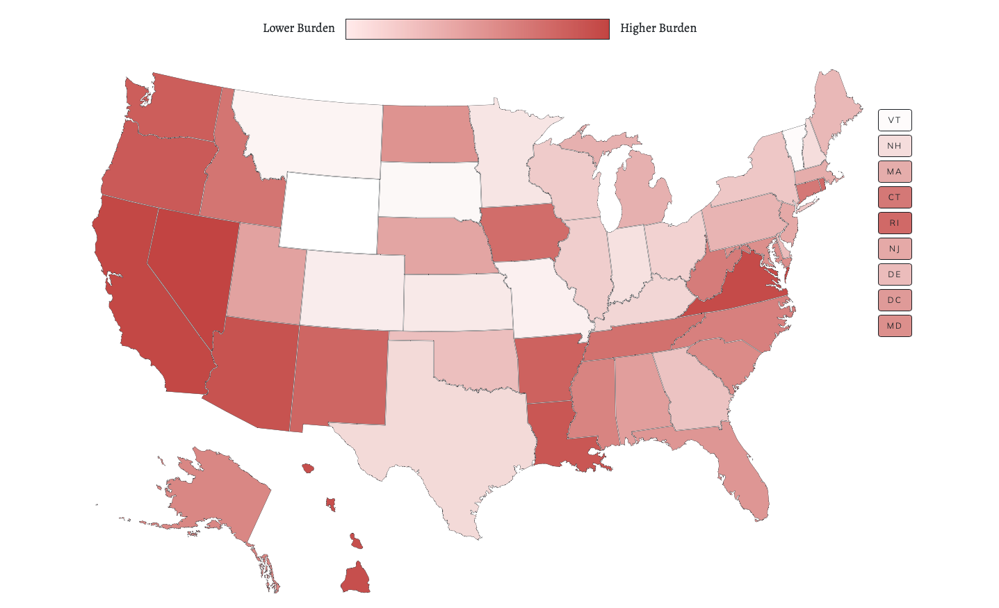 When compared to neighboring states, Connecticut fared worse than Massachusetts and New York, while Rhode Island ranked higher (11th), the worst in the northeast. Meanwhile, Vermont ranked as the least restrictive state in the nation.