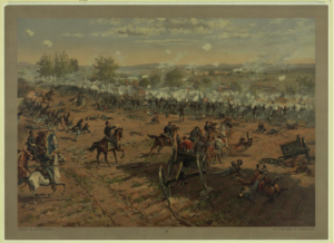 A print depicts Union troops advancing from the right during the Battle of Gettysburg. (Library of Congress)
